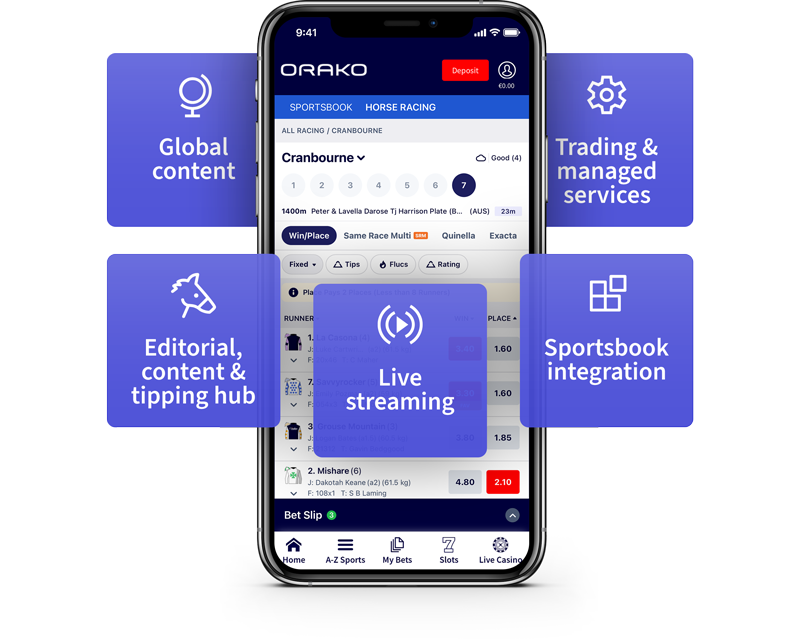 ORAKO Racebook puts you in pole position. Launch a premium racebook without building it from scratch. Get global content, expert trading, live video, tips and real-time pricing – all ready to go.