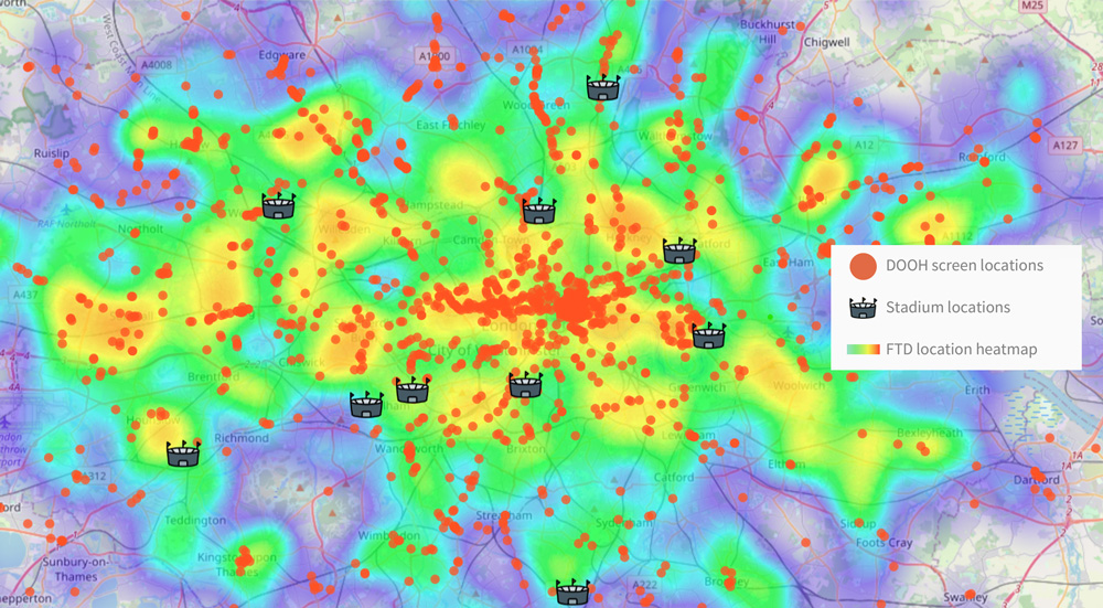 RO: Our inventory and our targeting algorithms allow betting and gaming operators to choose ad screen locations that are relevant to sportsbook and casino customers, e.g. sports venues, pubs, entertainment facilities and more. Additionally, our ad:s DSP data allows us to analyse all the locations where conversions take place, creating a heatmap of geographic areas with the highest likelihood of finding potential customers. This can be as granular as areas around addresses or neighbourhoods in a city to localize your campaigns as much as possible.