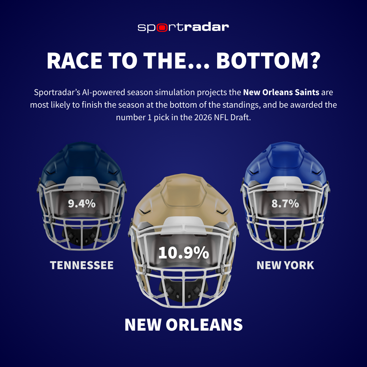 Sportradar’s NFL season simulation also projected the race to the bottom of the standings, identifying the New Orleans Saints (10.9%) as the most likely team to land the top pick in the 2026 NFL Draft. Close behind were the Tennessee Titans (9.4%) and New York Giants (8.7%), both strong candidates to also be on the clock early on the first on draft day.