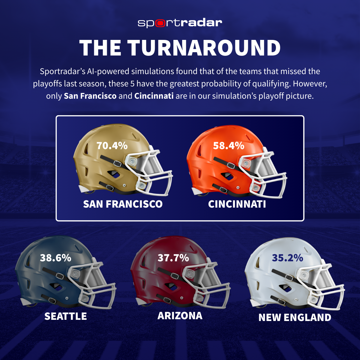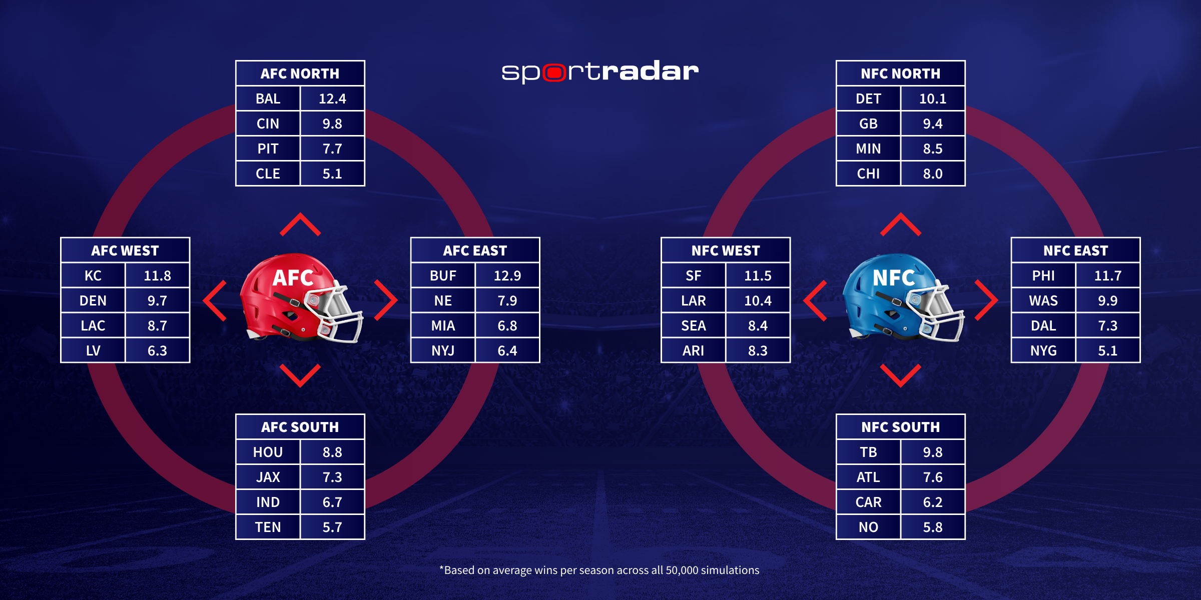 Sportradar’s NFL season simulation forecasted seven repeat division winners from last year and one new first-place team — the San Francisco 49ers overtaking the Los Angeles Rams in the NFC West.