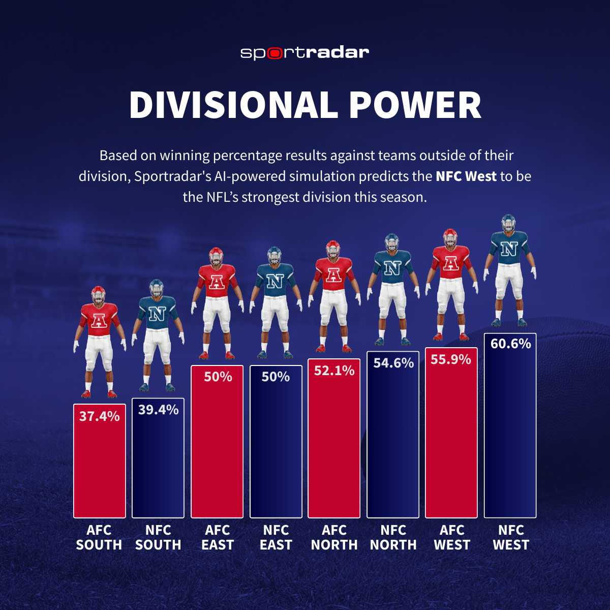 Sportradar’s simulation projected the strongest division this season which was determined based on each division’s record against non-divisional opponents. The results show the NFC West as the strongest division this season with a 62.1% winning percentage, while the AFC South is projected to be the weakest at 37.8%.